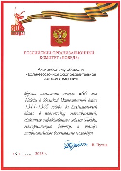 Коллективу АО «ДРСК» (входит в Группу РусГидро) вручена памятная медаль «80 лет Победы в Великой Отечественной войне 1941-1945 годов». В благодарственном письме, сопровождающем ценную награду, за подписью президента РФ Владимира Путина отмечено, что медаль вручается за значительный вклад в подготовку мероприятий, связанных с празднованием юбилея Победы, мемориальную работу, а также патриотическое воспитание молодежи.